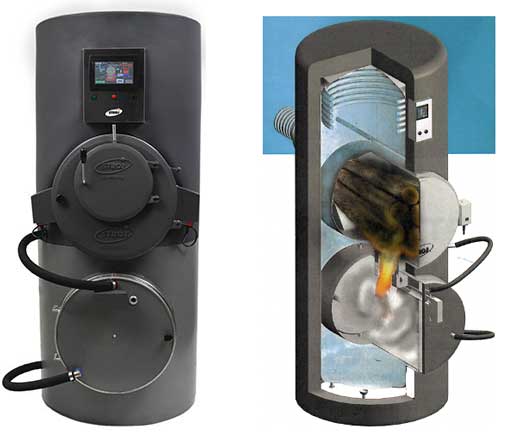 Lahko se odločimo, da na omenjeni menjalnik toplote priključimo toplotno črpalko. Kotelje zgrajen po principu predornin valjastih oblik, kar omogoča enostavno čiščenje notranjosti. Energent, ki ga uporabljamo so suha drva (relativna vlažnost do 20%), ki solahko dolga do 60 cm.... Visoka kakovost uplinjevalnega kotla je vezano na zanesljiv ventilator in gorilno komoro iz silicijevega karbida.